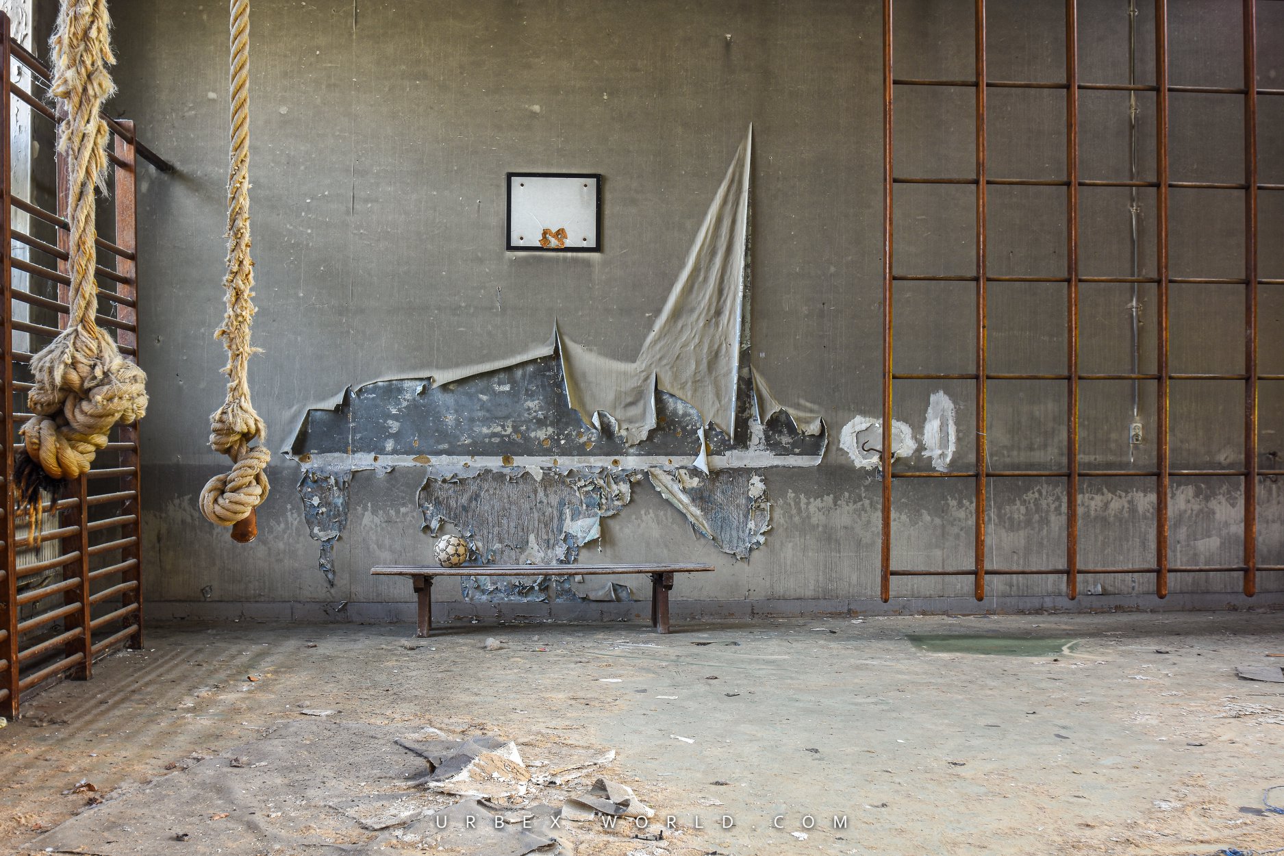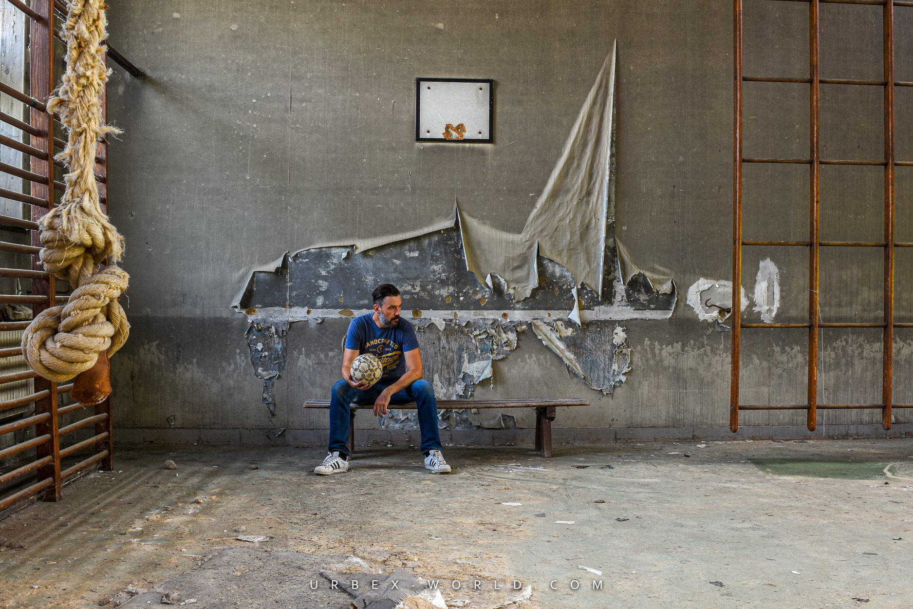 J’ai exploré cette petite école en 2019. L’accès n’était pas des plus simples : la seule ouverture possible était une petite fenêtre en hauteur, donnant directement sur la rue, par laquelle on pouvait à peine se glisser. À l’intérieur, ce qui m’a particulièrement séduit, c’est l’ancienne salle de gym. Même si elle est presque vide, elle conserve un charme indéniable. L’ensemble formé par le banc, les espaliers et le mur décrépi dégage une esthétique à la fois brute et poétique. J’ai d’ailleurs tellement aimé ce décor que j’y ai réalisé mon autoportrait.