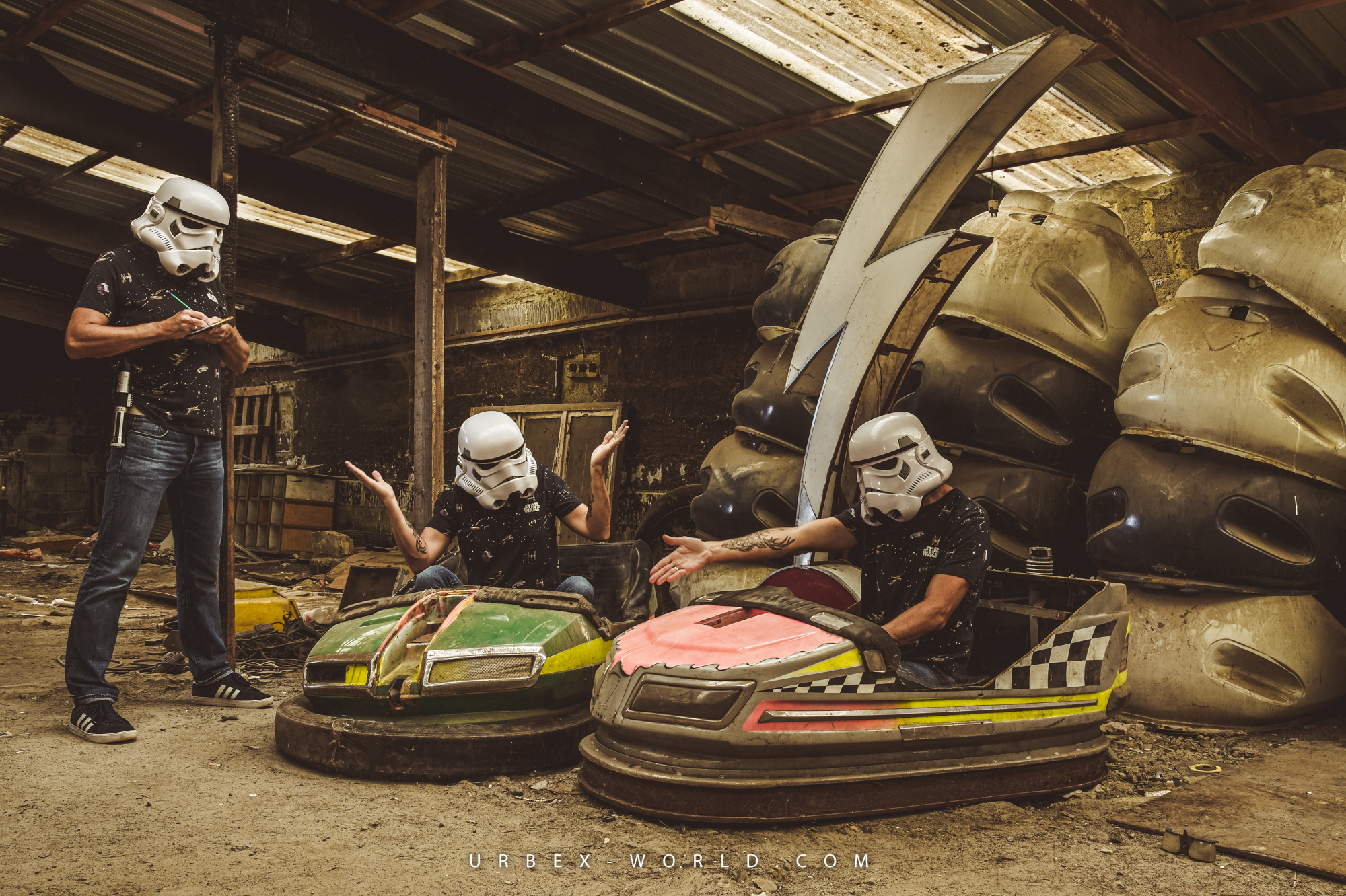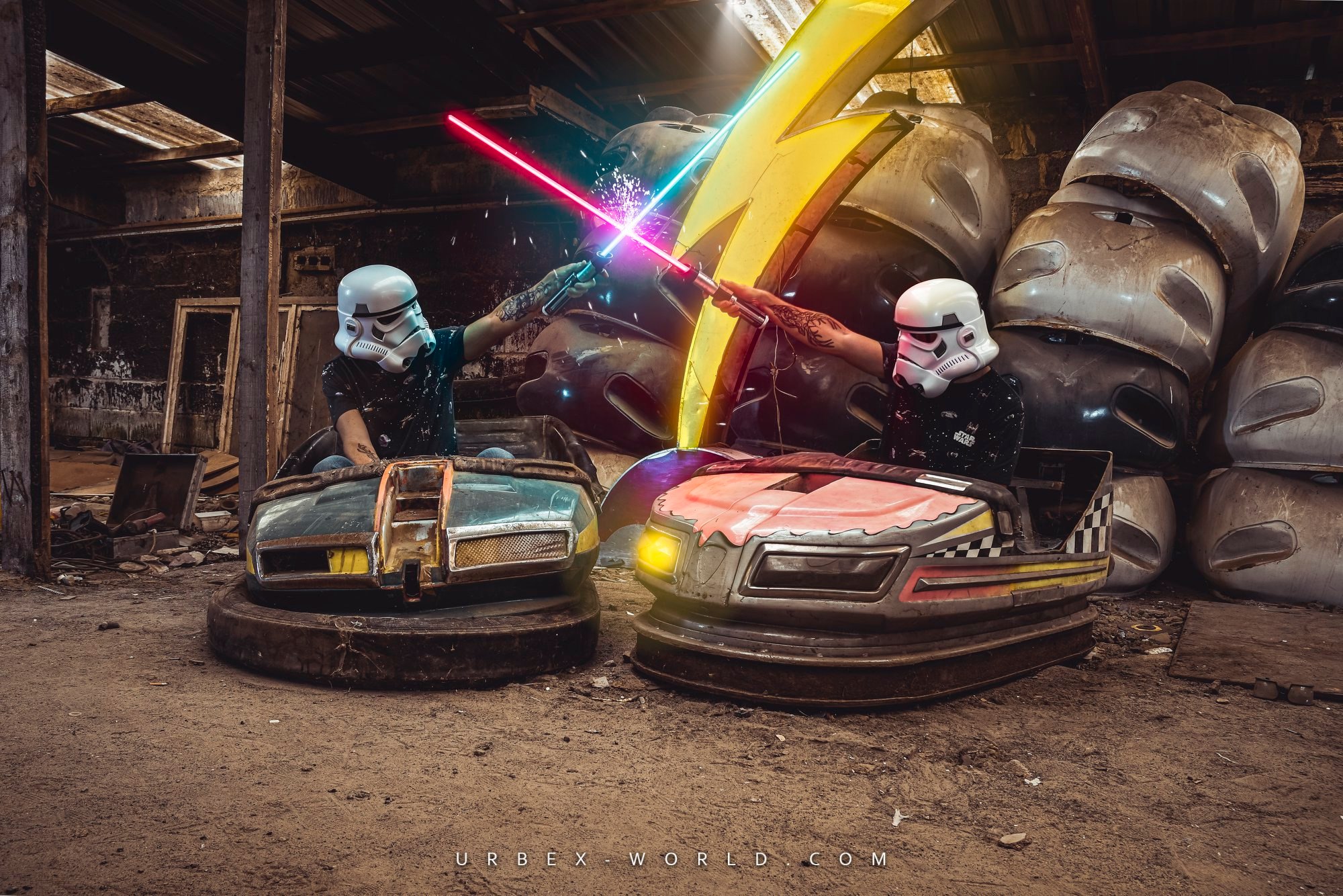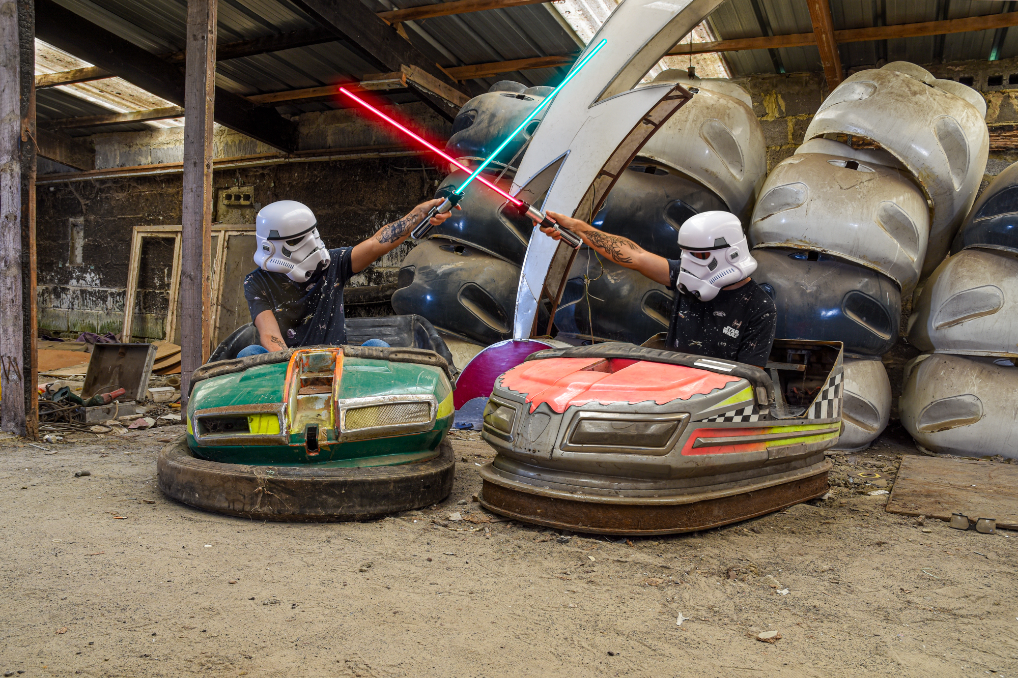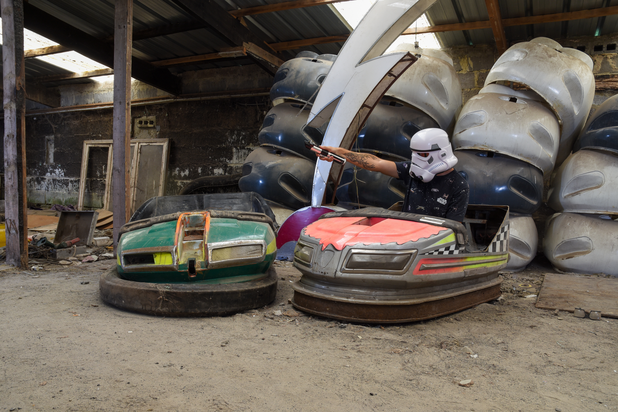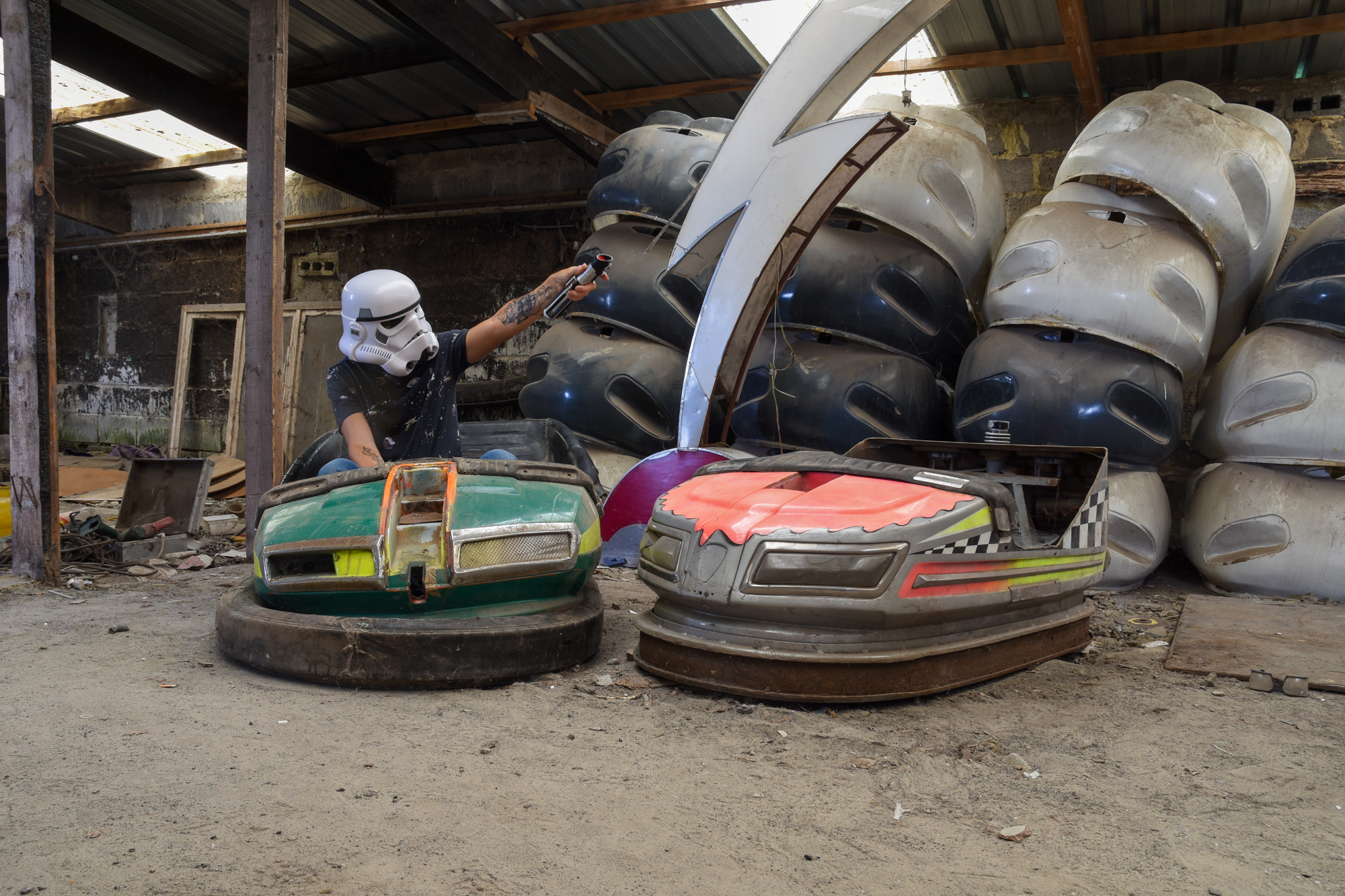 Lorsque je suis arrivé sur place, j’avais déjà imaginé une ou deux mises en scène mettant en valeur les autoscooters présents. Ce jour-là, j’étais venu préparé : casque de Stormtrooper, t-shirt Star Wars et le sabre laser de ma fille.