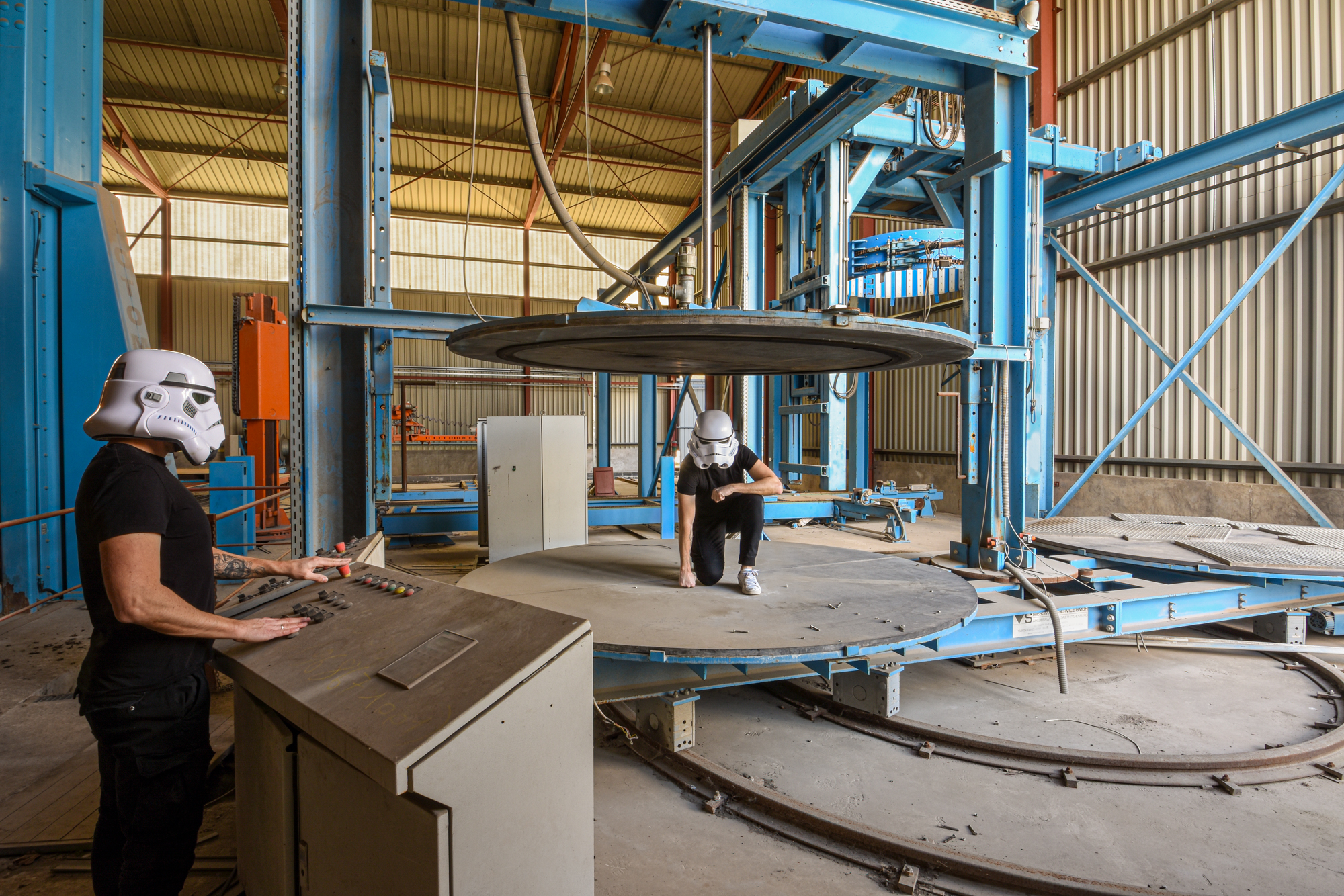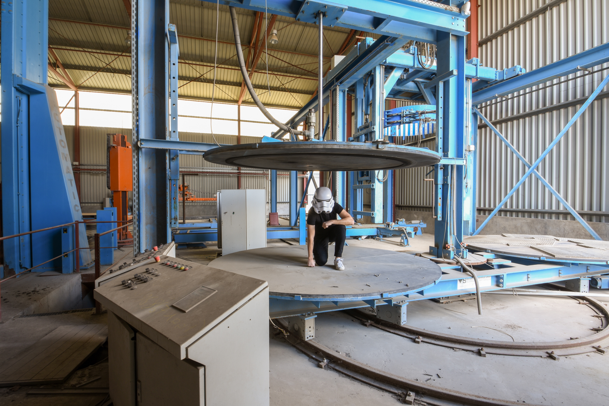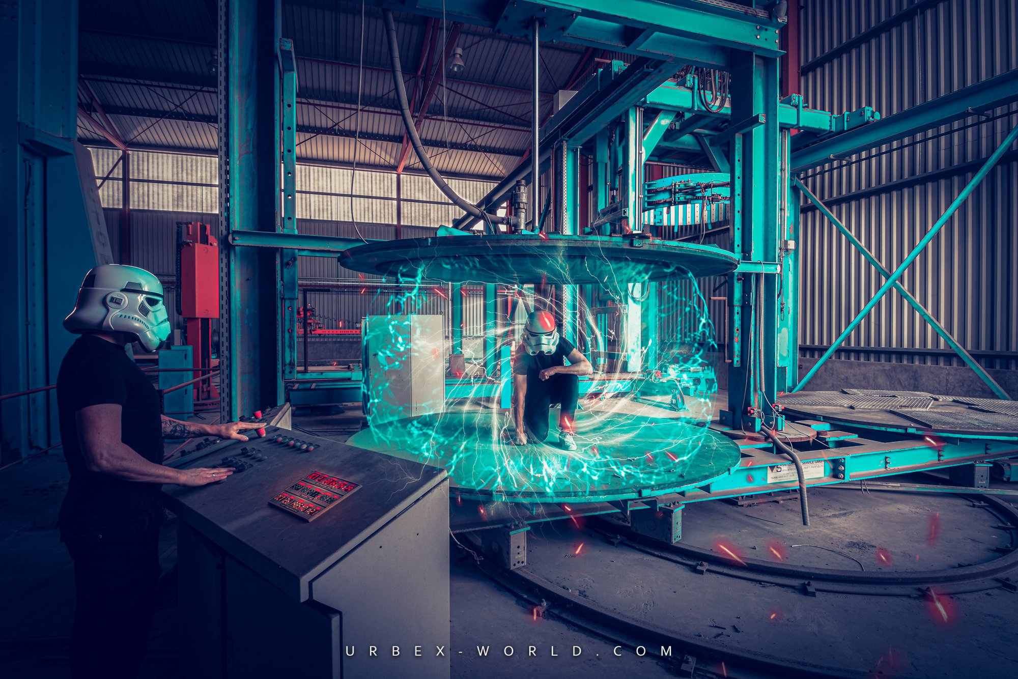À mon arrivée, j’ai été surpris de constater que le matériel était encore présent dans l’usine, laissée à l’abandon depuis 2019. Pour le montage que vous voyez devant vous, l’atmosphère du lieu m’a immédiatement donné envie de créer une composition sur le thème de Terminator. J’y ai également glissé une autre référence subtile… l’avez-vous repérée ?