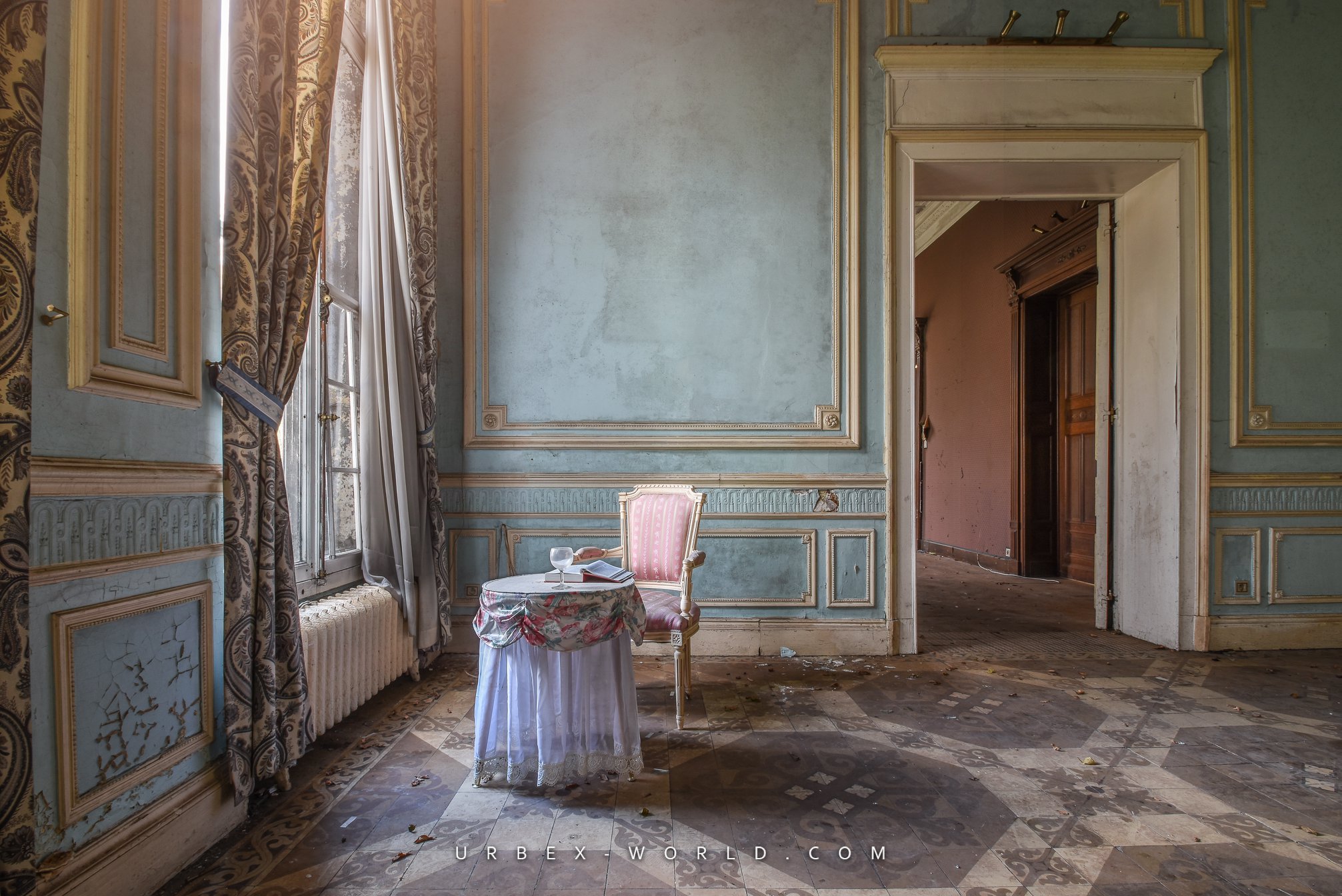 Déjà presque vidé en 2018, ce château conservait malgré tout un certain charme. J’ai eu un vrai coup de cœur pour cette grande pièce, celle que vous voyez ici, avec sa table placée face à la fenêtre. La disposition soignée de la table, de la chaise et du livre ne laisse guère de doute : il s’agit sans doute d’une mise en scène laissée par un explorateur précédent.